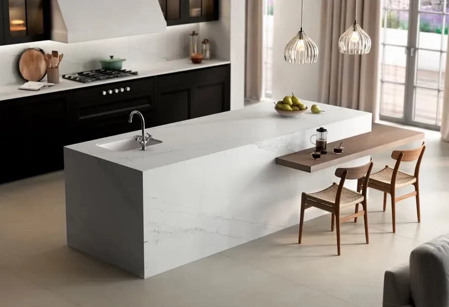 Silestone Ethereal Dusk is a compound made up of 94% natural quartz, which makes it an extraordinarily hard and resilient stone. This is the one and only worktop made of quartz with anti-bacterial protection, giving it hygienic properties that are not to be found anywhere else on the market. It is an excellent surface for kitchen worktops, bathrooms, floors and wall cladding using the minimum number of joints. Silestone Quartz products will bring surfaces with incredible mechanical properties to your creations. Firstly, the materials are highly resistant to high temperatures and freeze. This means you can use them in any interior application that requires a thermal resistant material. Secondly, it is non-porous. This enhances your experience with a product that is easy to clean and does not require sealants. Coupled with the exclusive treatment, it also acts as liquid repellent surfaces. If great performance was not the only thing required for all projects, the brand offers huge versatility. You can choose Silestone from a pallet of over 50 colours. You can also choose slabs or tiles. Silestone Ethereal Dusk slabs are available in Jumbo sizes with dimensions . HybriQ+ technology 100% reused water 0% Liquid discharge 100% renewable electric energy 20% recycled materials When it comes to different types of application, you may need lightweight surfaces. For this reason, the Company offers slabs in 12mm, 20mm and 30mm. These ensure you can create vertical and horizontal designs with any Silestone
